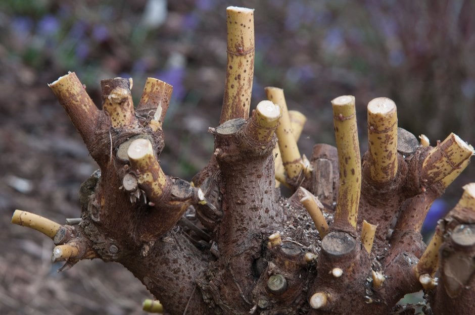 Hard pruning shrubs, such as dogwoods and willows, removes most of the top growth and dominant buds. This allows dormant buds at the base to sprout into growth and produce a flush of colourful new stems.