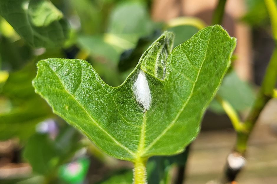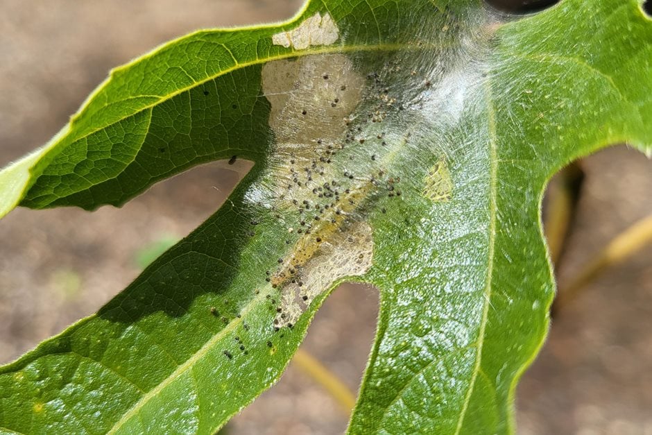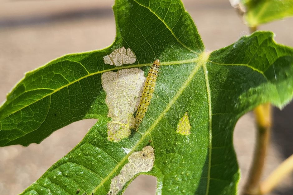 - Search for caterpillars, and bound up leaves/ webbing and squeezing, crushing any caterpillars or pupae that are concealed within. Monitor fig trees frequently so this action can be taken before populations build up