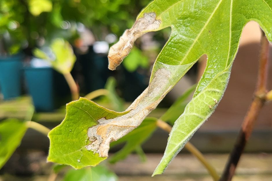 It is the caterpillar stage of the fig leaf skeletoniser that is responsible for causing the damage to fig leaves and occassionally fruit: