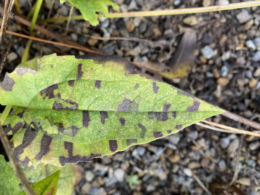 Main symptoms - Characteristic interveinal yellow, brown and black blotches most apparent at the end of growth season