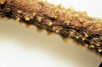 - On stems: Young stems die back and under wet conditions tiny raised pimples (fruiting bodies of the fungus) can be seen on the
