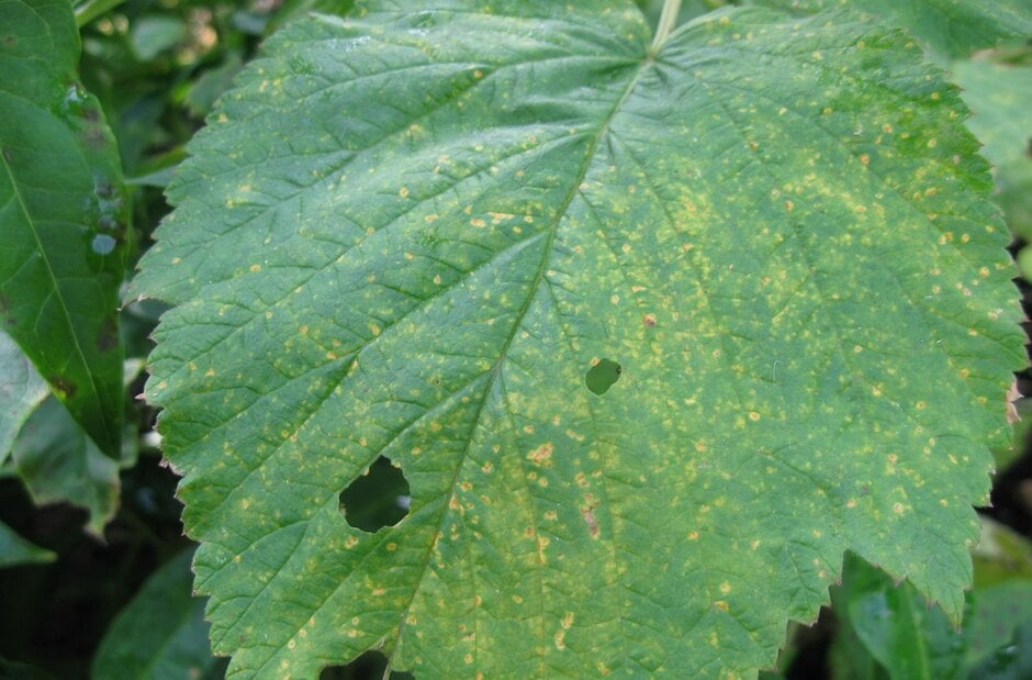 Unlike some other rust fungi the life cycle for raspberry rust does not involve an alternate host.