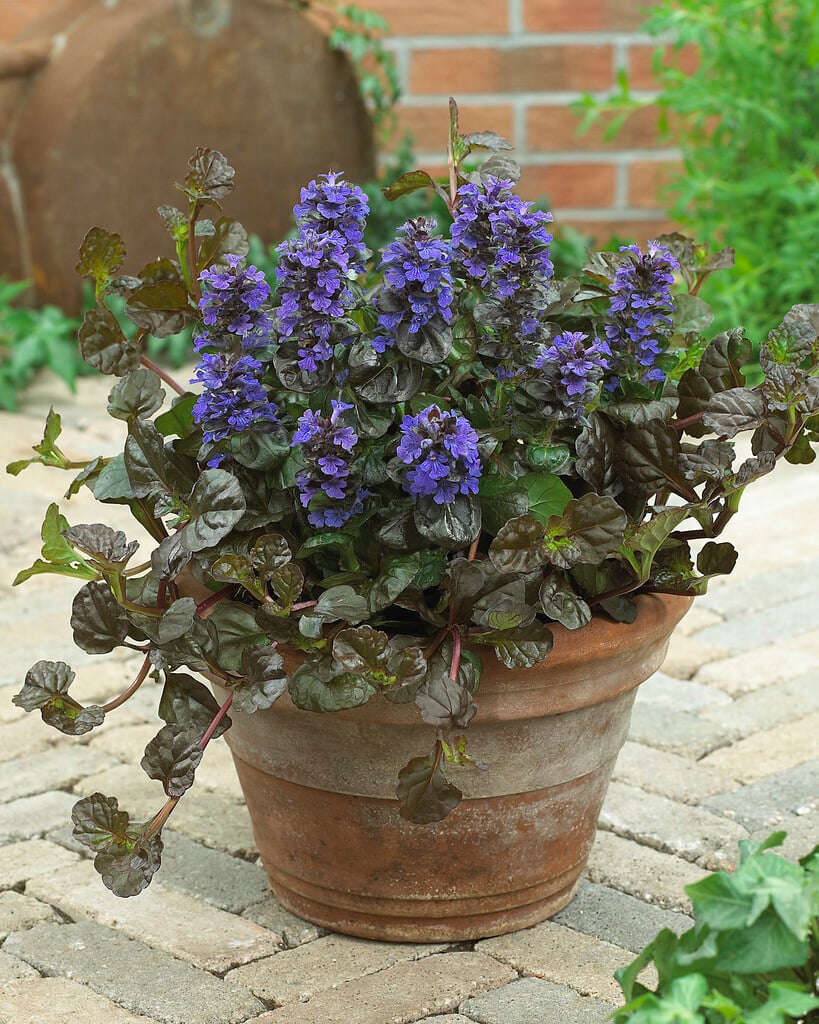 Ajuga are mostly spreading, rhizomatous perennials with attractive evergreen foliage, rarely annuals, with whorled two-lipped flowers forming short spikes