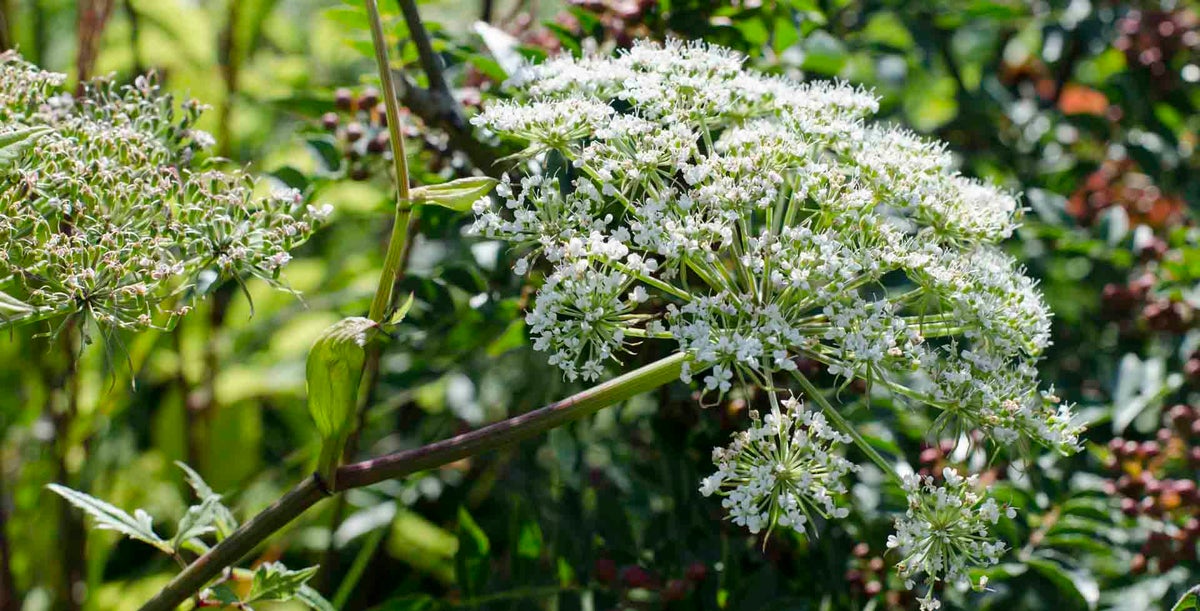 Angelica species grow up to 2.5m tall, with sturdy, pink-purple stems and large, divided leaves. Their flowers are arranged in dramatic, round heads, ranging from white to pale green, and appear in early to mid-summer.