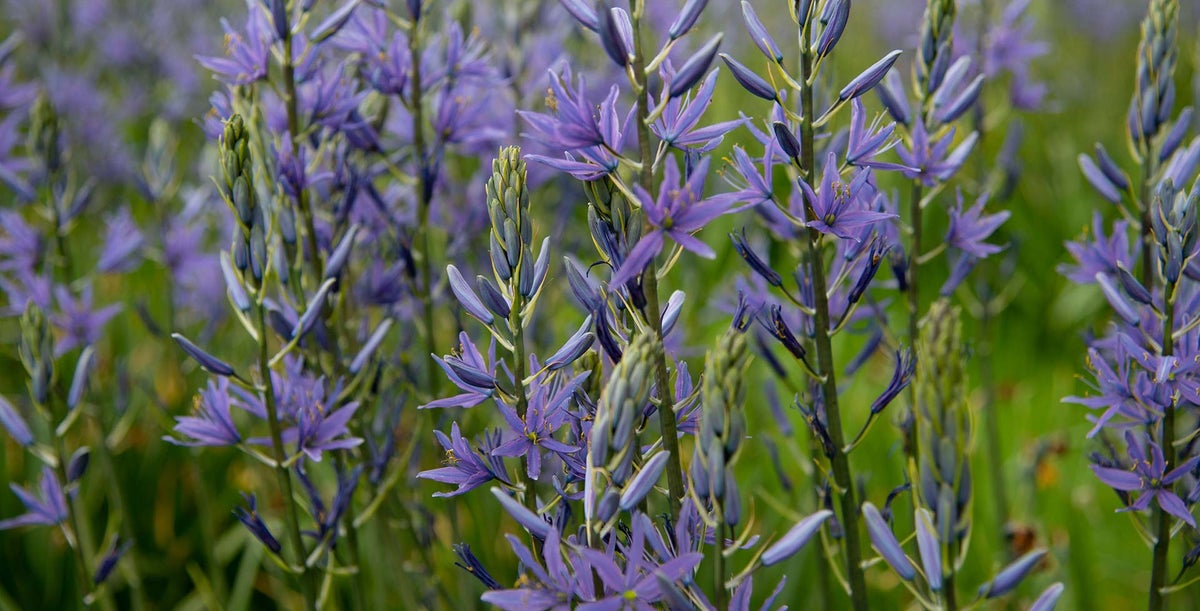 Camassia produce upright spires of star-shaped flowers in shades of violet-blue, white or pink. These flower spikes appear from late spring to early summer and can reach over 1m (3â…“ft) high. They are joined by a rossette of long, narrow rich-green leaves beneath.