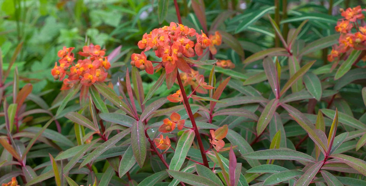 Some like Europbia amygdaloides makes attractive evergreen groundcover with the dark or purple leaves acting as a foil for the acid yellow flowers. E. griffithii offers orange bracts and bronze infused foliage. They all appreciate soil that doesn't dry out in summer and, although happy enough planted in full sun, they do well in dappled shade.