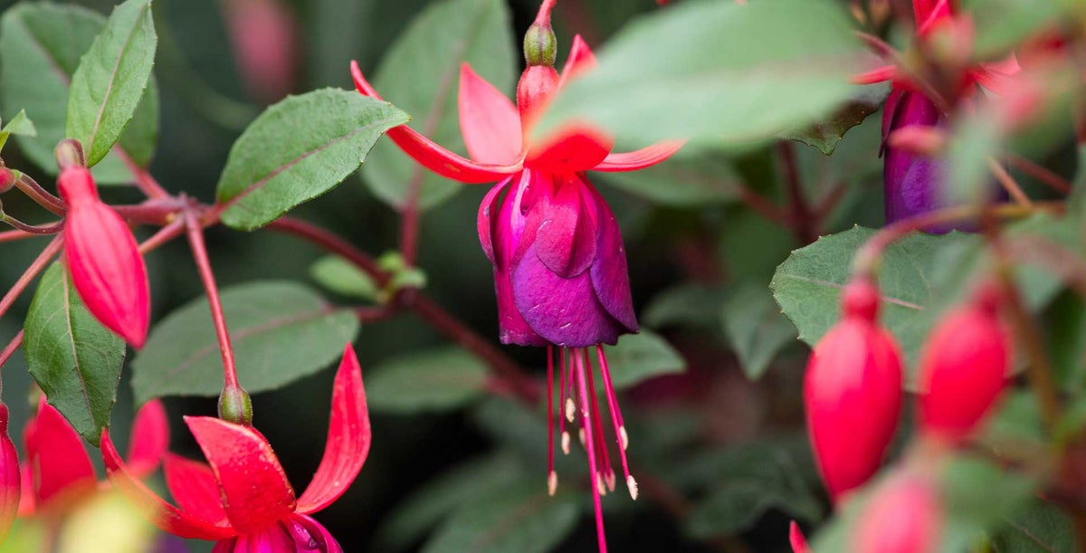 Fuchsias flower continuously from mid-summer to the early frosts, providing colour and interest with their pendent blooms. Their flowers are diverse, ranging from dainty and elegant to bold and bright, which makes them great additions in bedding displays, containers or borders.