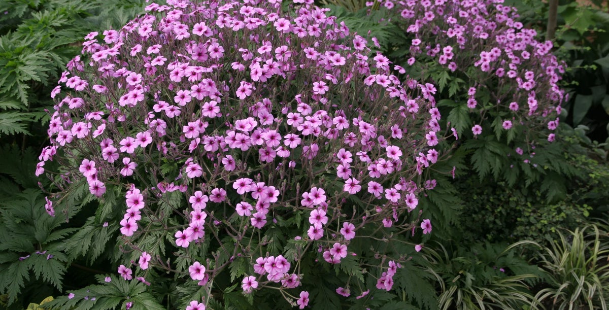 From their second year, tender geraniums bear exotic-looking domes of large, mauve-pink flowers throughout summer above tall, hairy or brownish-red stems
