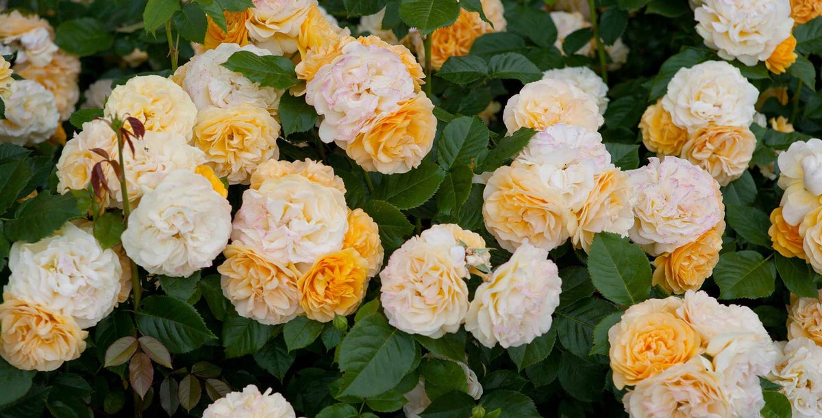 Modern bush roses produce masses of flowers, sometimes richly fragrant, in colour shades of white, cream, yellow, pink, red, crimson, purple and orange; some are striped, bi-coloured or multi-coloured. Hybrid Tea roses are usually upright and vase-shaped with large pointed flower buds and bear each flower, or small clusters, on a single stem. Floribunda roses are rounded and bushy and produce blooms in large clusters.