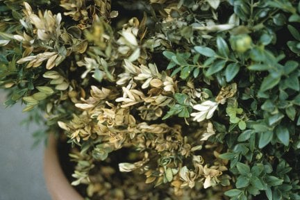 P. buxi requires wounds for infection and is associated with environmental stress or clipping in wet weather. It is not a serious disease and improving cultural conditions will usually lead to plant recovery. Diseased branches should be pruned out when the foliage is dry, and old fallen leaves removed from the interior of affected plants.