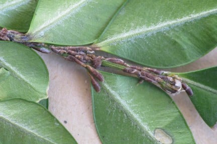 Fluted scale, Icerya purchasi, is a sap-feeding insect which, until recently, was largely confined to heated greenhouses. It still an uncommon problem, especially on outdoor plants, however in recent years it has become more widespread. This insect has a very wide range of host plants, including box, and heavy infestations can cause a lack of vigour. The adult scales are flat, oval insects about 4-5 mm long and reddish brown in colour. The females deposit their eggs amongst mounds of white waxy fibres that have a grooved appearance, these can be found on the stems and foliage. The scales excrete a sticky honeydew on which black can grow.